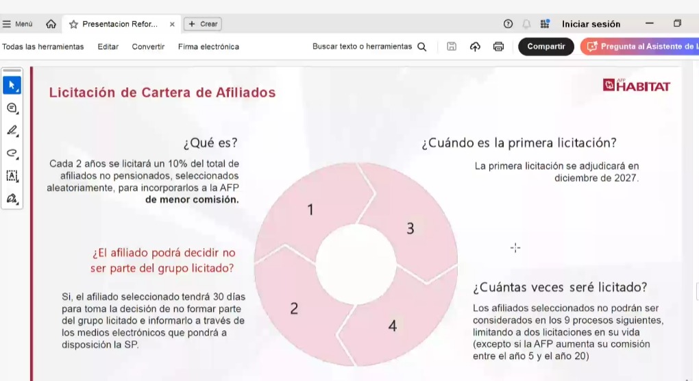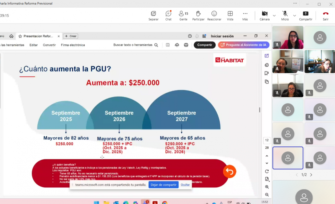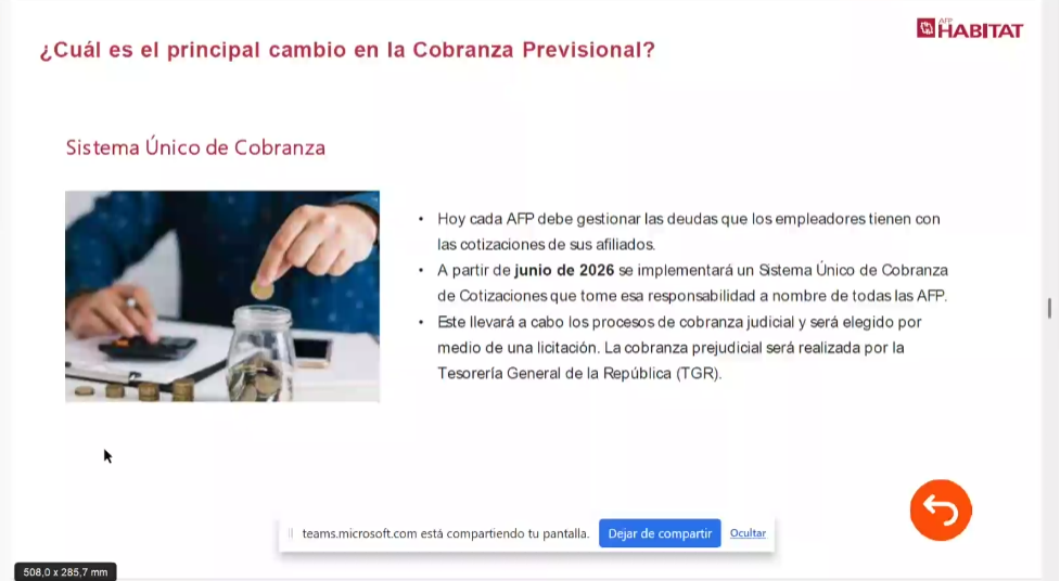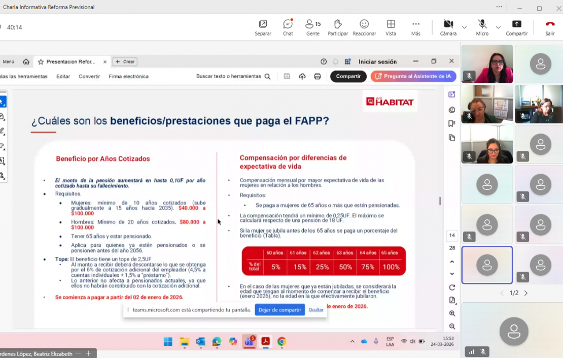 Durante la jornada se abordaron contenidos clave relacionados con cotizaciones, multifondos, Ahorro Previsional Voluntario (APV) y las opciones disponibles al momento de la jubilación, generándose un espacio de diálogo cercano y participativo entre los asistentes y la representante de AFP Hábitat. dejando también la pagina web para consultas de beneficios: Consultas de Beneficios del Seguro Social